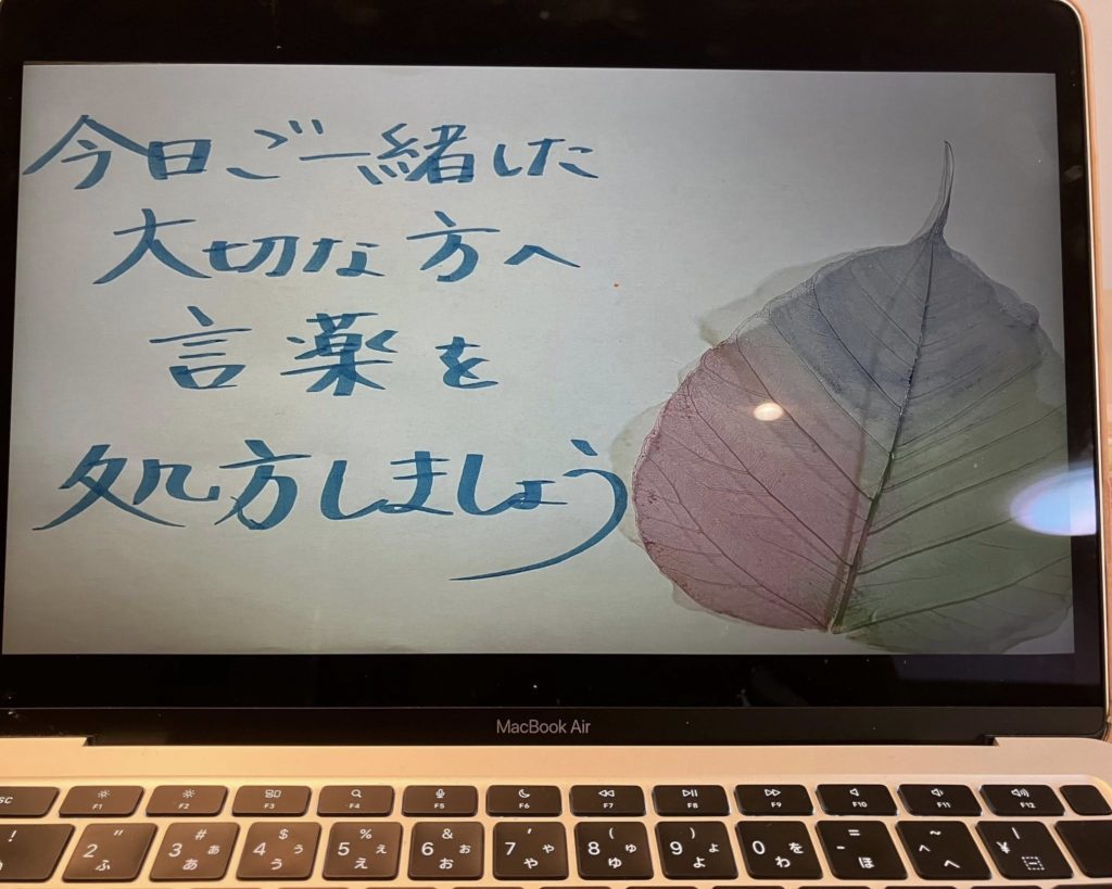 今回も、言葉が持つ力を自分自身で、そして学生さん同士で感じてもらいたく、大坂巌先生が提唱されている「言薬(ことぐすり)」から作らせていただいた「言薬ギフトワーク」の時間をみなさんで過ごしました。